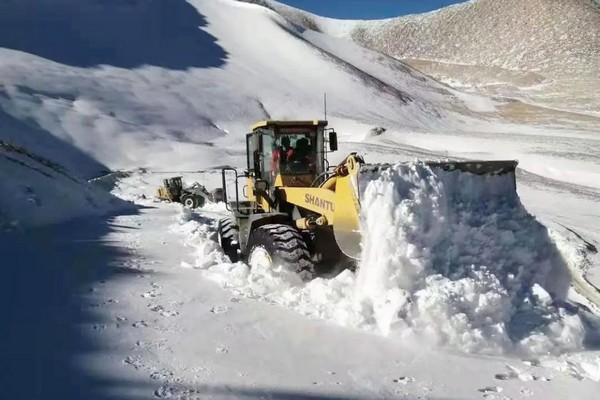 公路籌備組保通人員巡查發(fā)現(xiàn)險(xiǎn)情后,立即啟動(dòng)除雪保通應(yīng)急預(yù)案,積極投入到除雪保通工作中。為確保在最短的時(shí)間內(nèi)恢復(fù)道路通行,12名保通人員、5臺(tái)裝載機(jī)夜以繼日,冒雪夜戰(zhàn),清理積雪30多萬立方米。此次參與公路除雪任務(wù)的山推5噸裝載機(jī),動(dòng)力強(qiáng)勁,轉(zhuǎn)向靈活,掘起力大,提升力強(qiáng),滿斗率高,特別適合松散物料的裝載鏟運(yùn)作業(yè)。歷時(shí)30多小時(shí),積雪路段恢復(fù)通行。為進(jìn)一步提高道路通行能力,保通人員繼續(xù)對(duì)該路段進(jìn)行路面拓寬施工,繼續(xù)奮戰(zhàn)6個(gè)多小時(shí),保通工作全面完成。