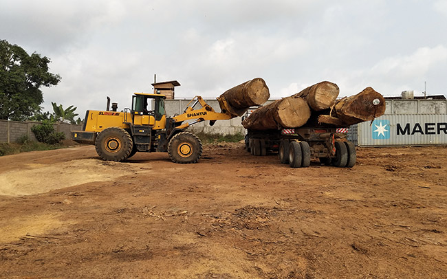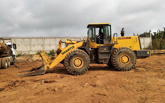 山推裝載機工作于喀麥隆某公司堆場及林地,裝配木料專用裝卸屬具。